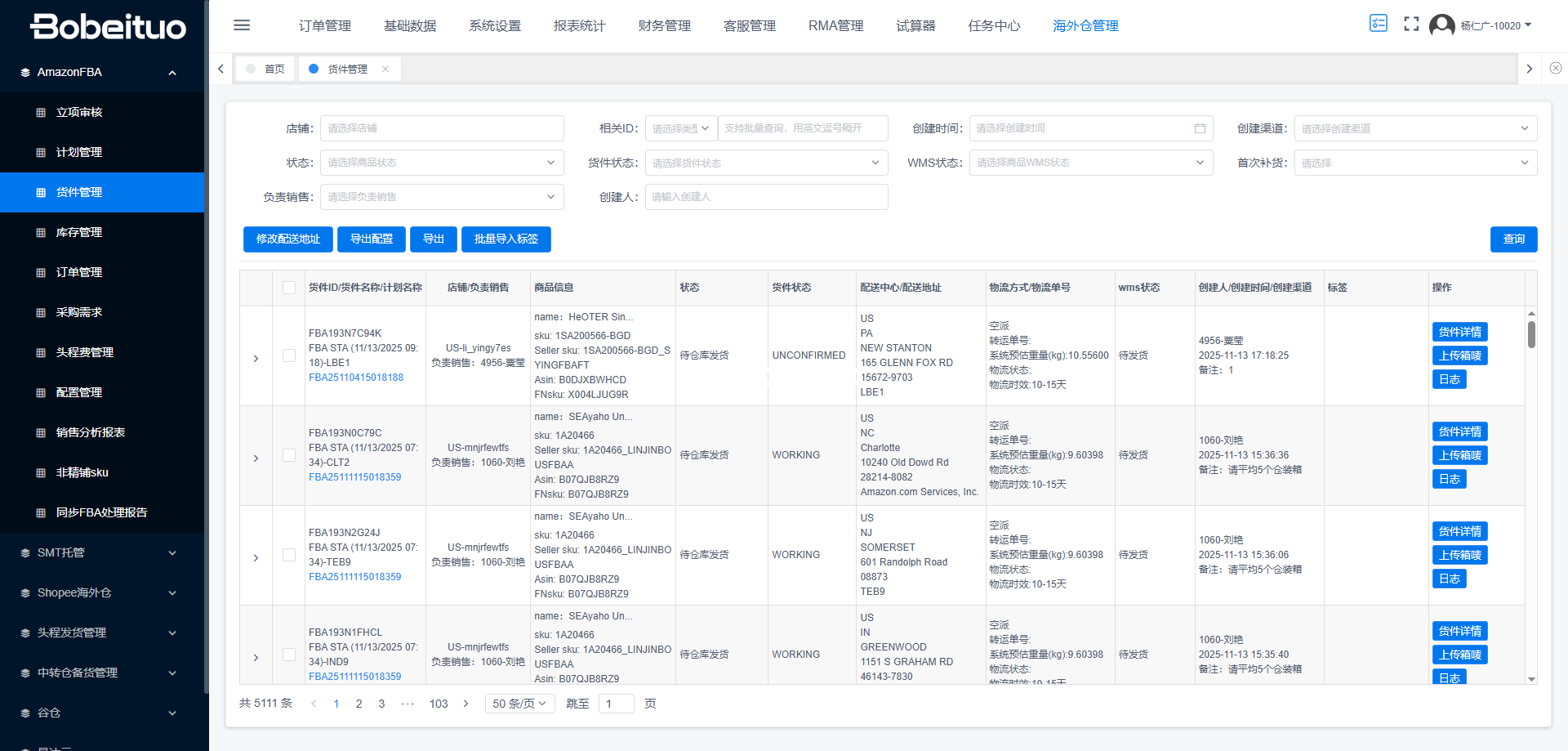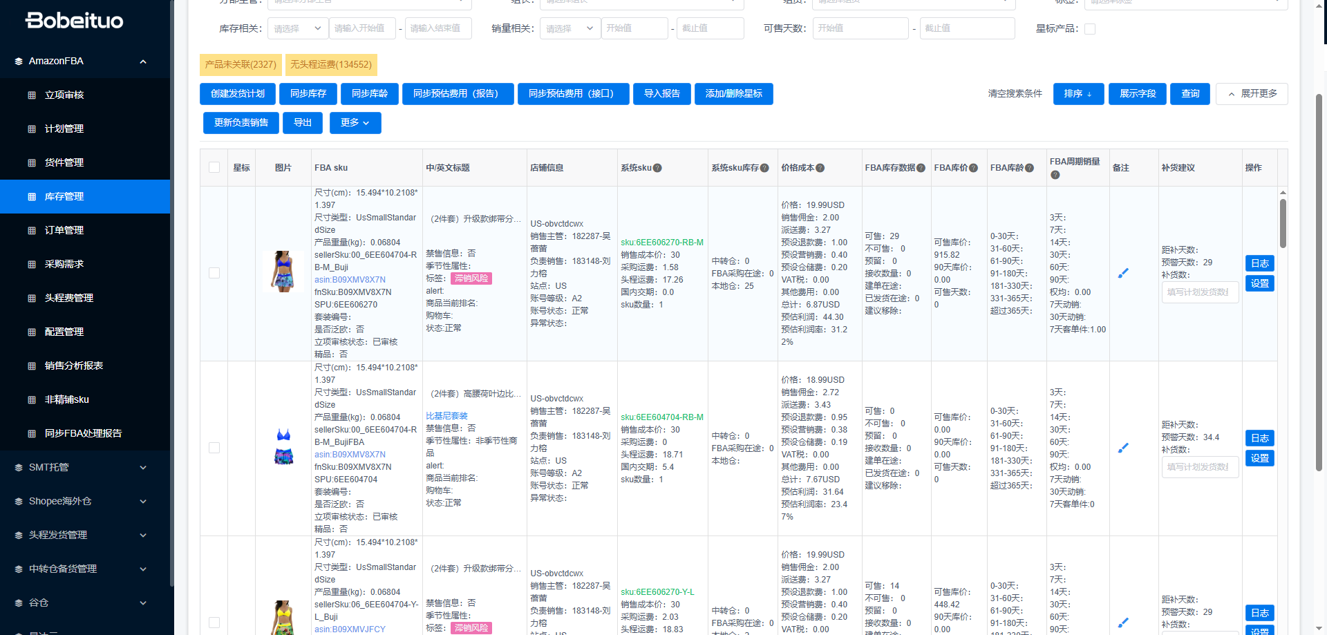 完整覆盖 FBA 头程发货操作,包括创建 FBA 补货计划、智能合并箱规、生成标签、货件跟踪等流程。系统自动对接亚马逊仓库网络,实现库存补货建议、库存分仓预测、货件状态监控及异常预警,确保商品快速、安全地抵达亚马逊仓库,为后续由 Amazon 执行的存储与配送提供可靠保障。