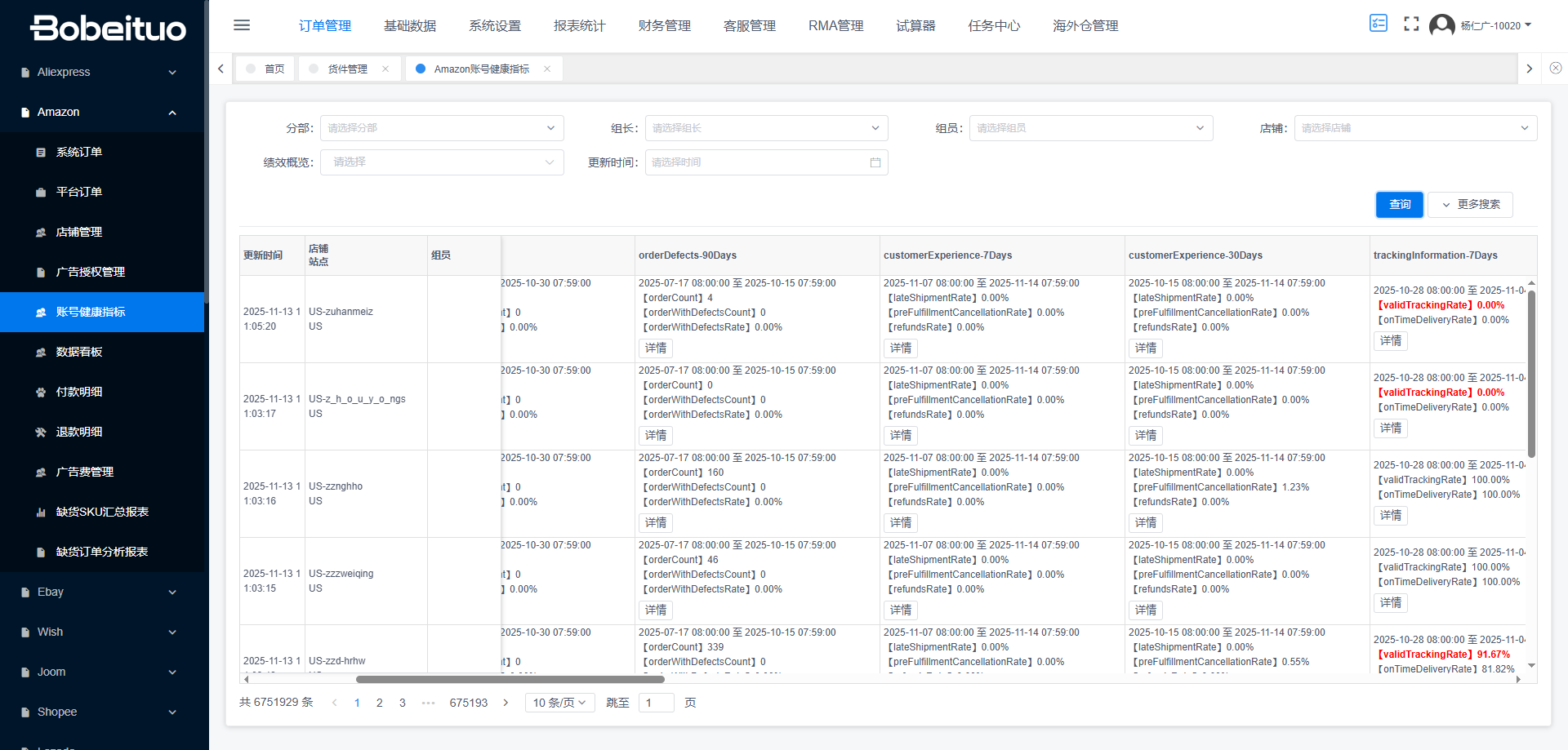实时同步亚马逊卖家账户表现数据,包括订单违约率、配送表现、商品合规状态、政策风险等关键指标。系统自动检测潜在违规风险并提供提醒,帮助卖家保持良好的店铺健康度,降低账户受限或下架风险。